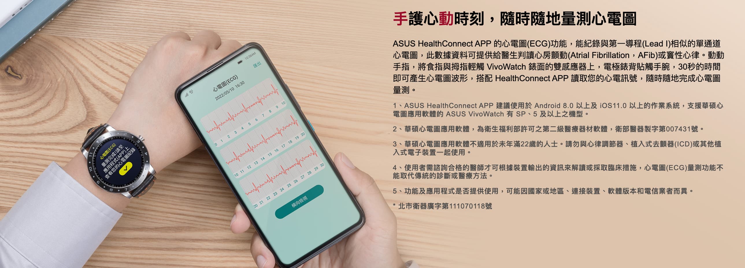 “華碩”心電圖應用軟體:ASUS HealthConnect APP的心電圖(ECG)功能,能紀錄與第一導程(Lead I)相似的單通道心電圖,此數據資料可提供給醫生判讀心房顫動(Atrial Fibrillation,AFib)或竇性心律。