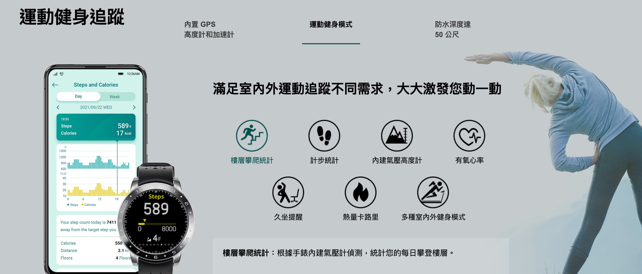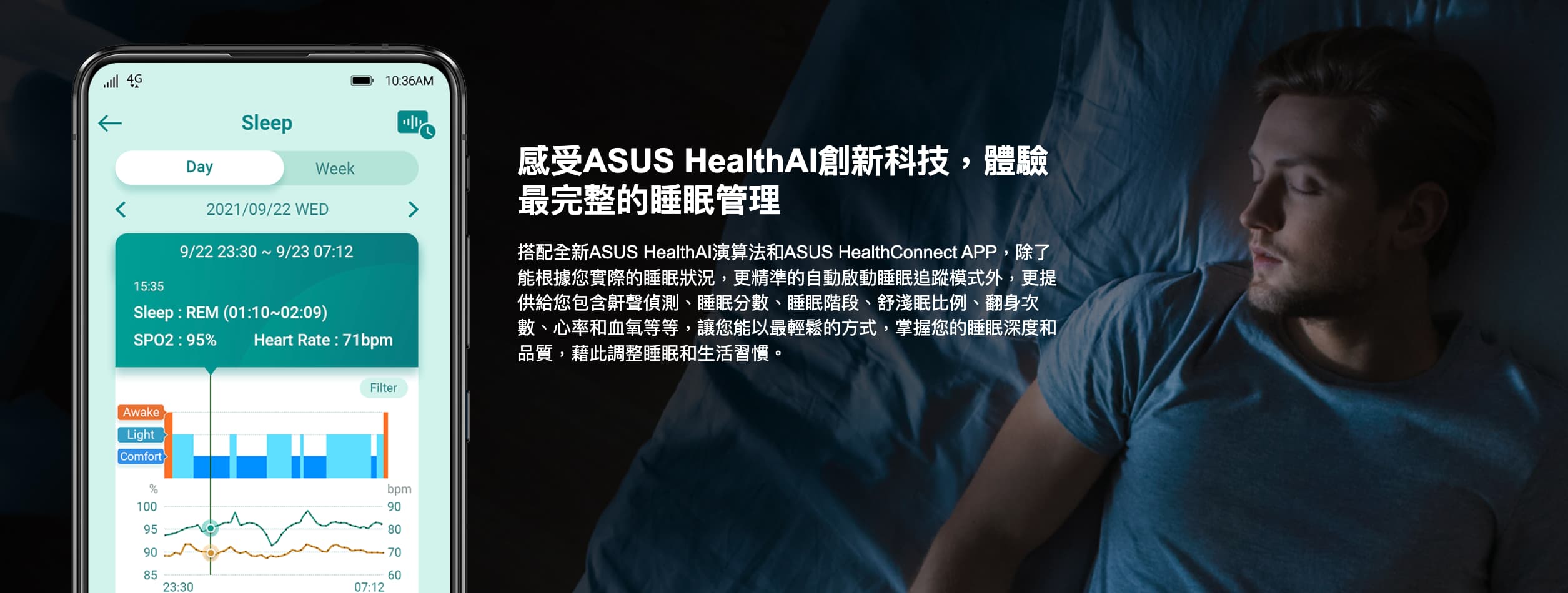 健康管理  (1) 計步 (2) 熱量 (3) 睡眠品質管理 (鼾聲偵測、睡眠時間、翻身次數、平均心率、舒眠淺眠比例)。