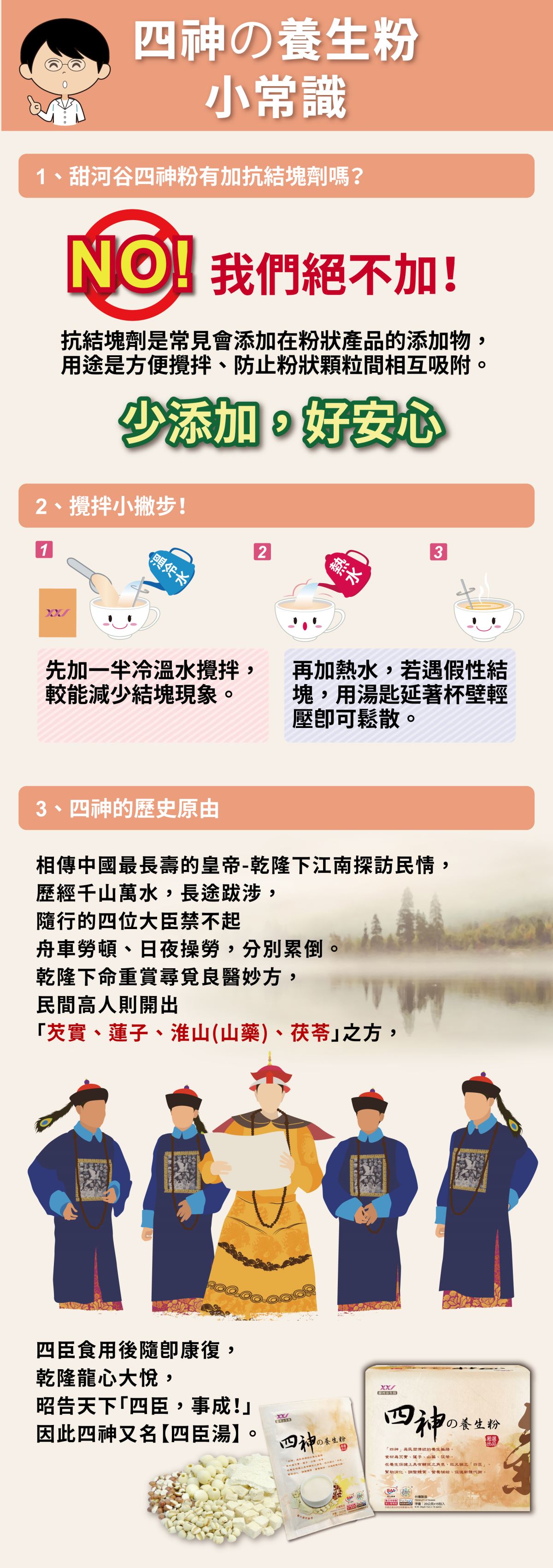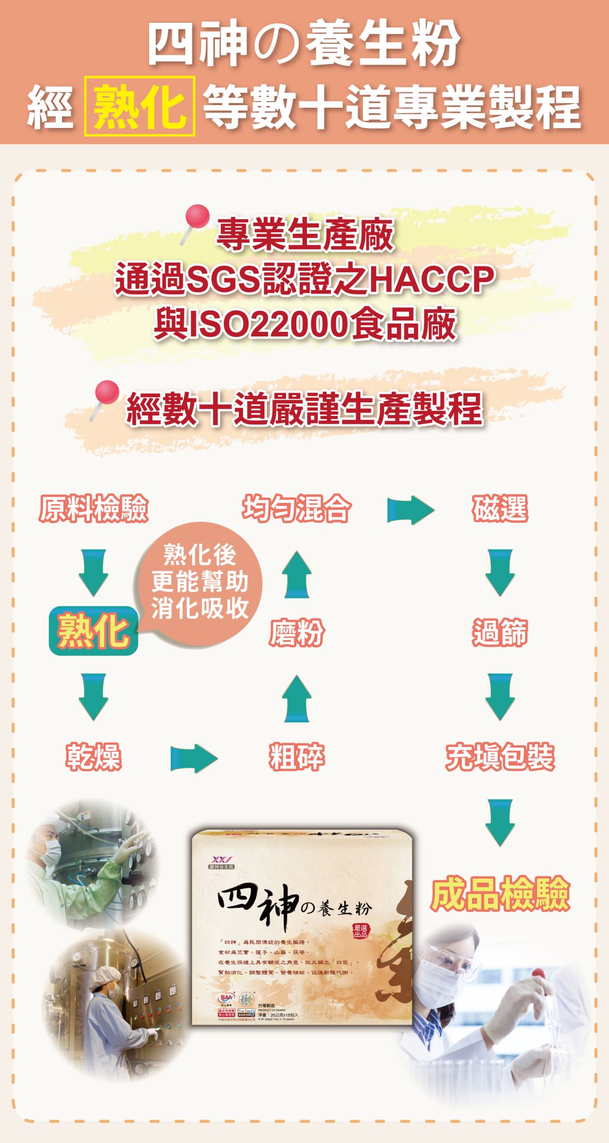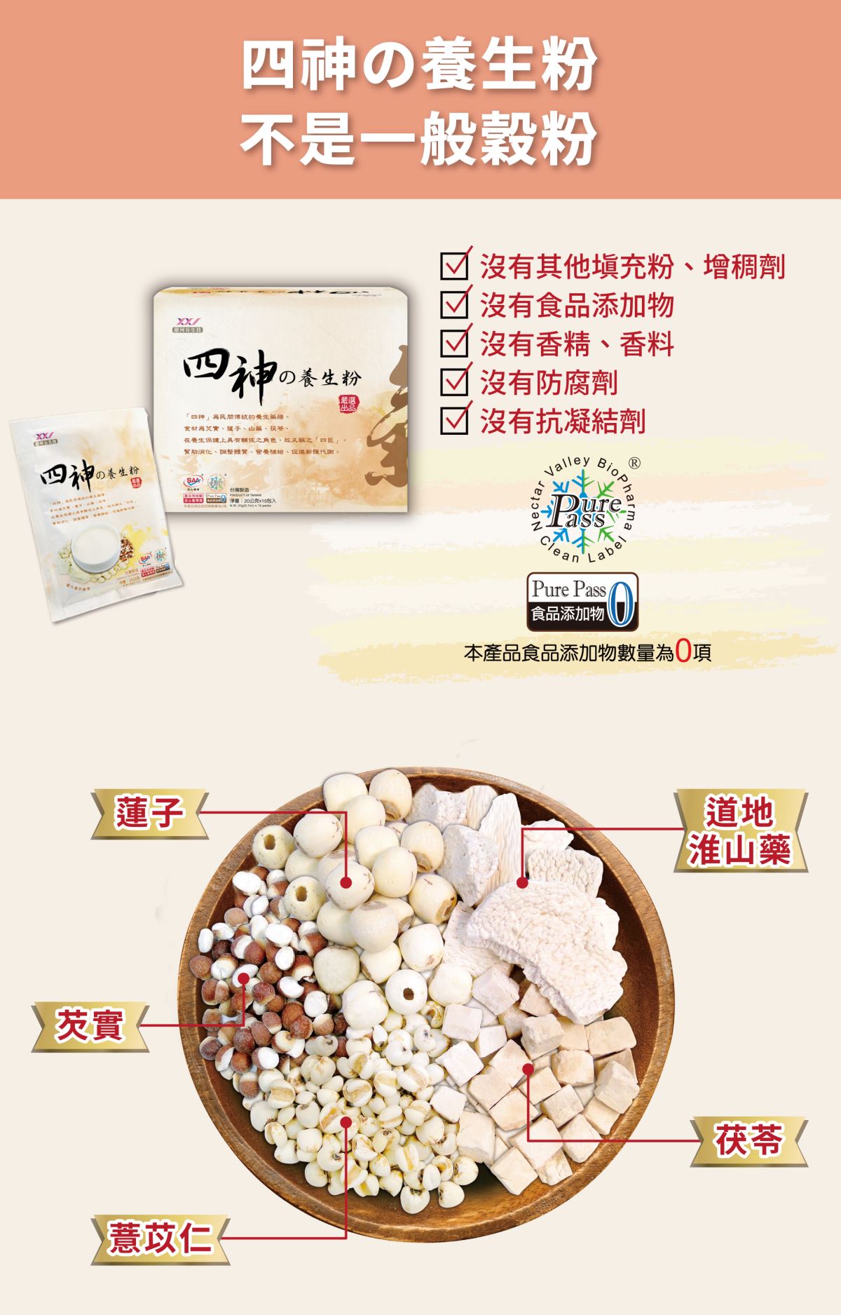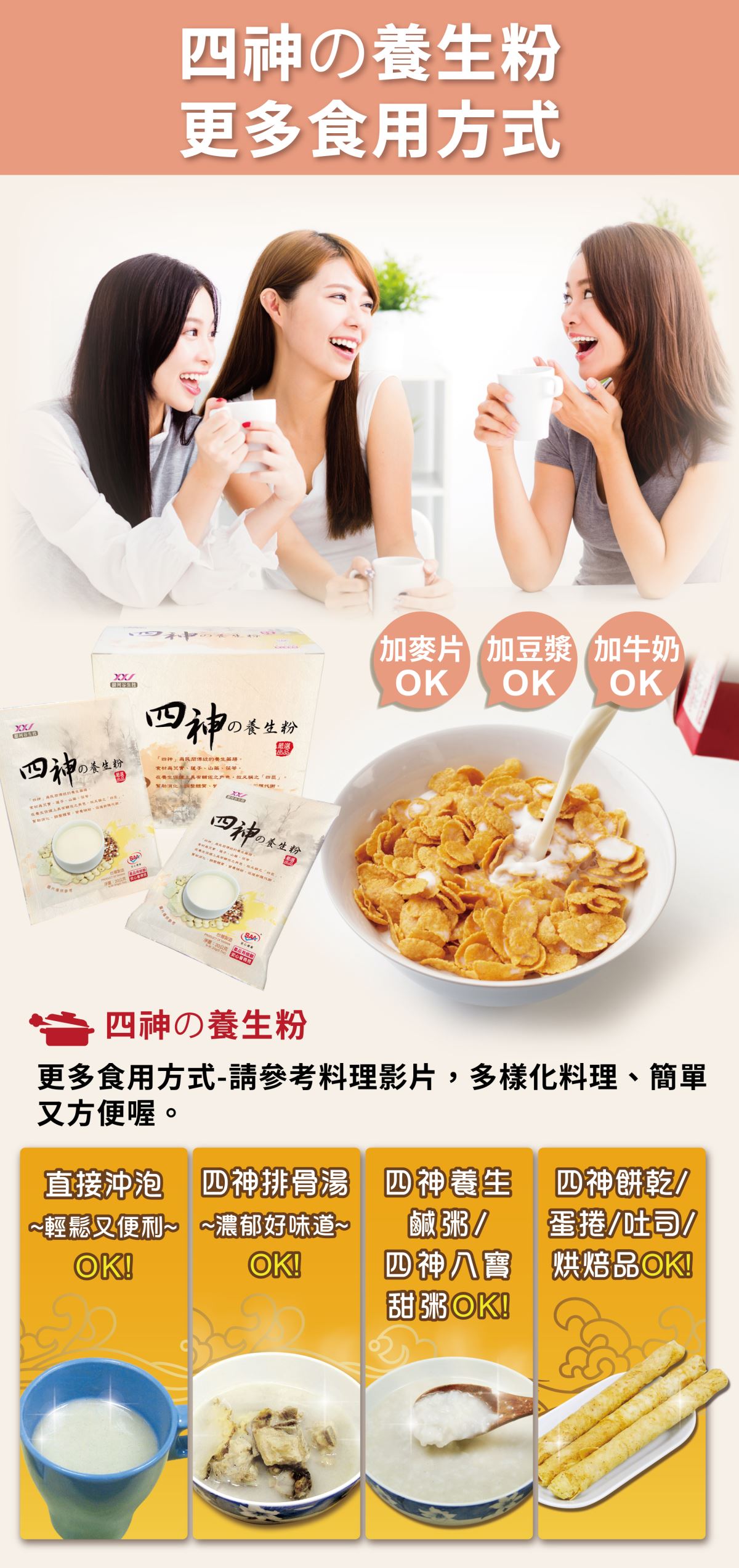 ❶ 四神粉不是一般穀粉,是由傳統藥膳四神-蓮子、芡實、山藥、茯苓經熟化等數十道程序研磨之養生粉。