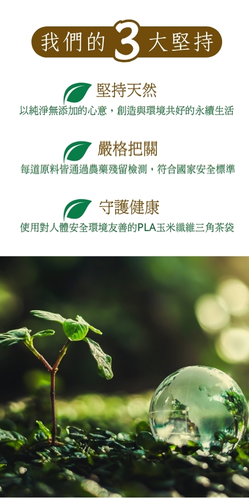 安心宣言 | 使用對人體安全,環境友善的PLA玉米纖維三角茶袋,每道原料皆經過食品檢驗機構農藥殘留檢測, 符合標準