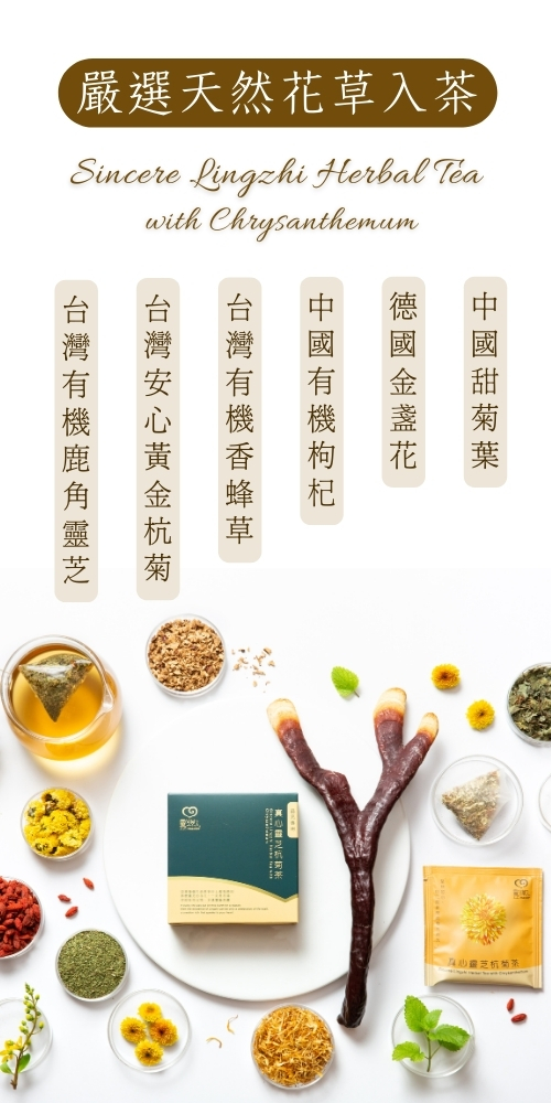 茶品原料 | 台灣杭菊、台灣有機香蜂草、中國有機枸杞、台灣有機鹿角靈芝子