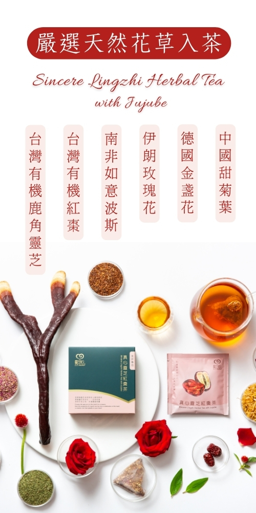 茶品原料 | 台灣有機紅棗、南非如意波斯、伊朗玫瑰花、台灣有機鹿角靈芝子 實體、德國金 盞花、中國甜菊葉