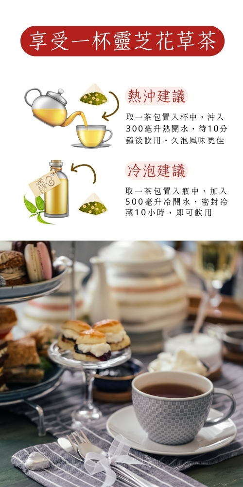 熱泡:取一茶包至入杯中,沖入300毫升熱開水,等待10分鐘後飲用,久泡風味更佳