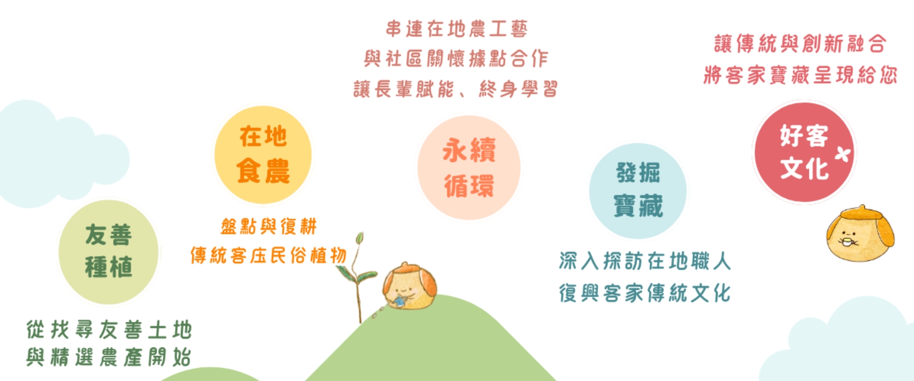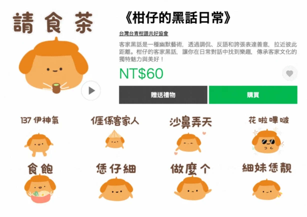 頭份的五個特產製作成的在地圖騰,搭配順口的客家黑話,將農村文化與客語傳承融入日常。讓這些貼圖陪伴您的每一天,隨時隨地說出地道的客家諺語,體會客庒文化的魅力。