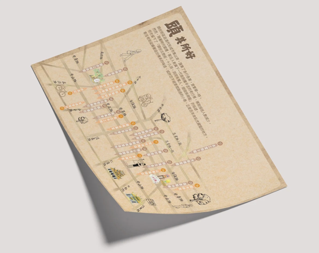 這套客庒來寮的舊好時光,被巧妙地收錄在一個地圖手拿包裡,讓您循著1945年頭份老地圖中的舊地名,探訪頭份市的老市場,閱讀今日街區巷弄中的隱市風景。
