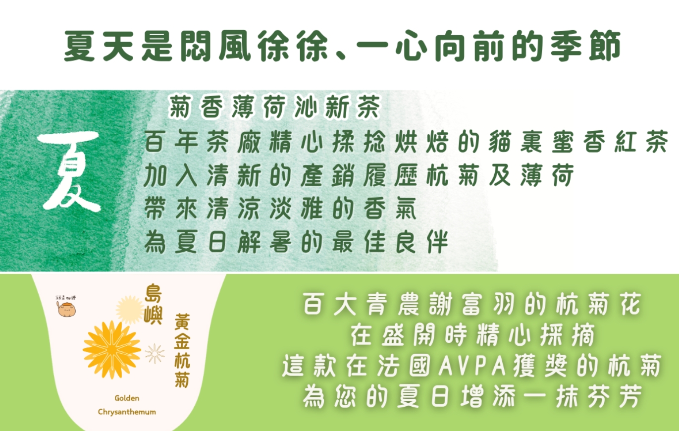 歷經 2 年 10 個月的歲月沉澱,萃取出這款蘊藏著頭份老產業與傳承記憶的茶組合。由頭份與苗栗在地農職人以友善方式種植,飲一口,即能品味頭份的好客風情與歷史韻味。