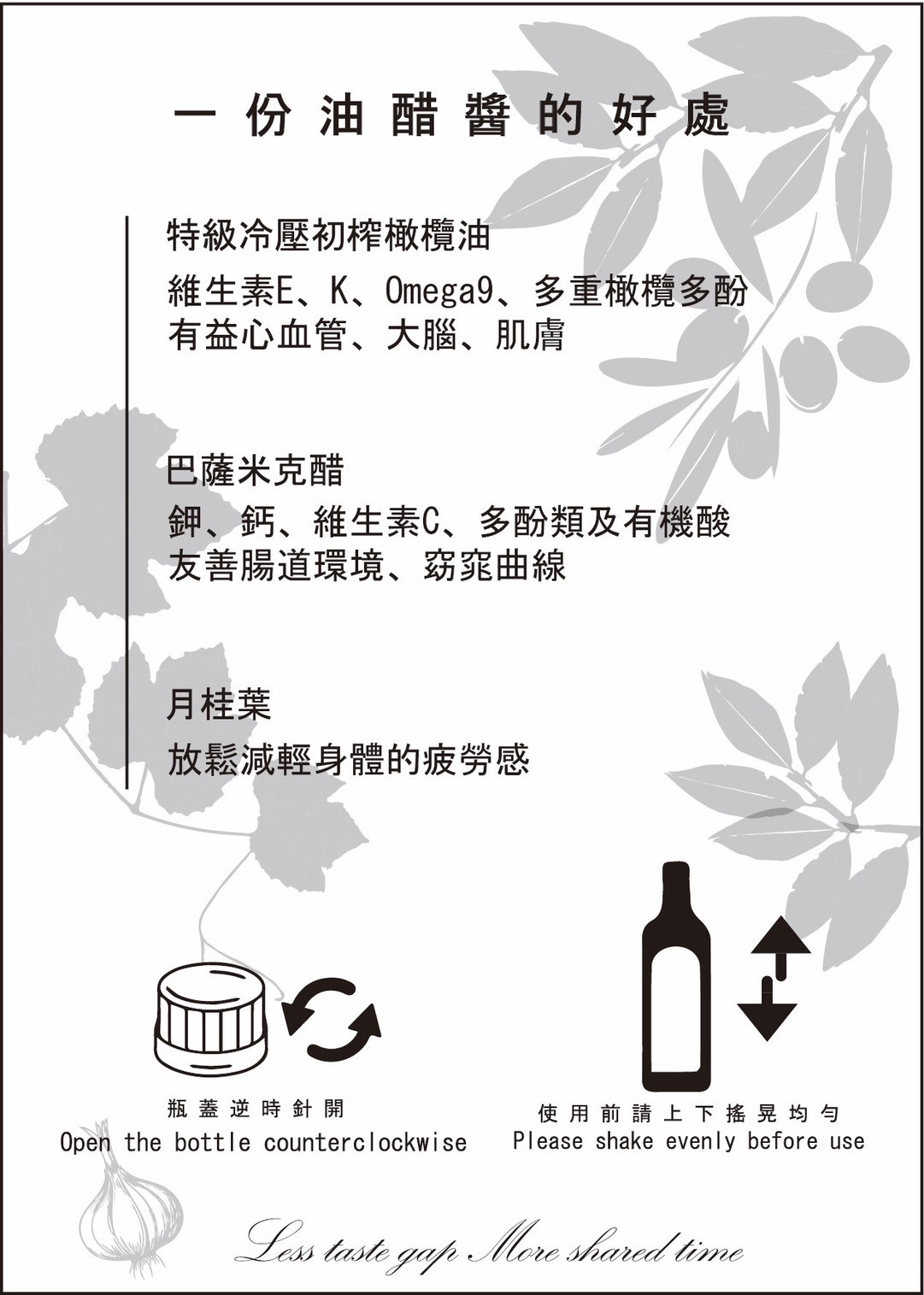 成分 : 巴薩米克醋.特級冷壓初榨橄欖油.月桂葉.鹽.糖.蒜