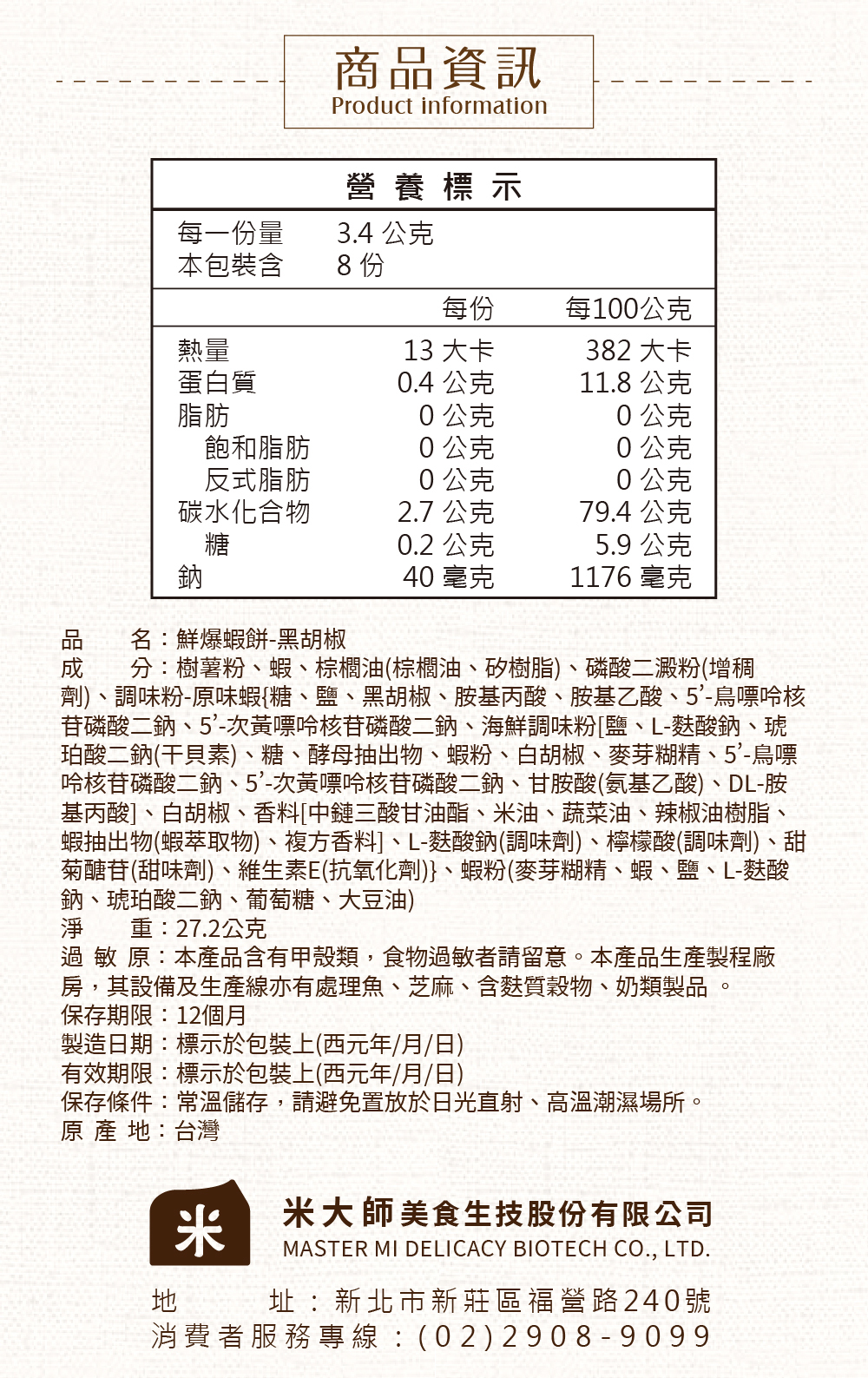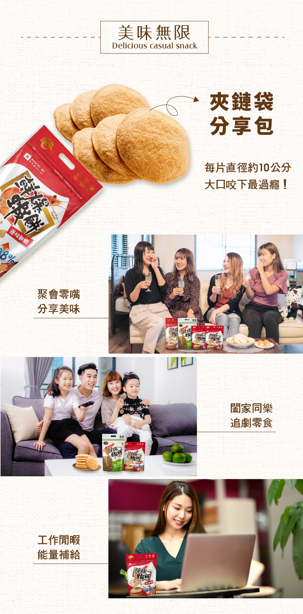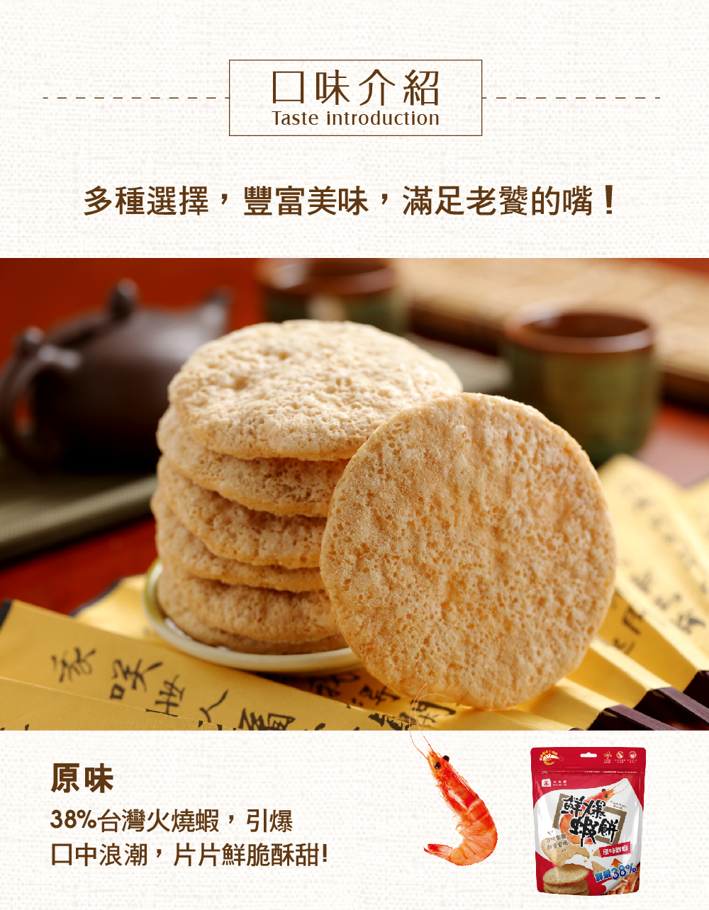 |嚴選高雄旗津頂級火燒蝦,每片蝦餅鮮蝦含量達38% |高壓烘焙非油炸,酥脆可口,不油膩 |無添加人工色素、防腐劑、反式脂肪,食用少負擔 新鮮現爆蝦餅,鮮蝦氣味十足!簡簡單單未加調味吃的也過癮!