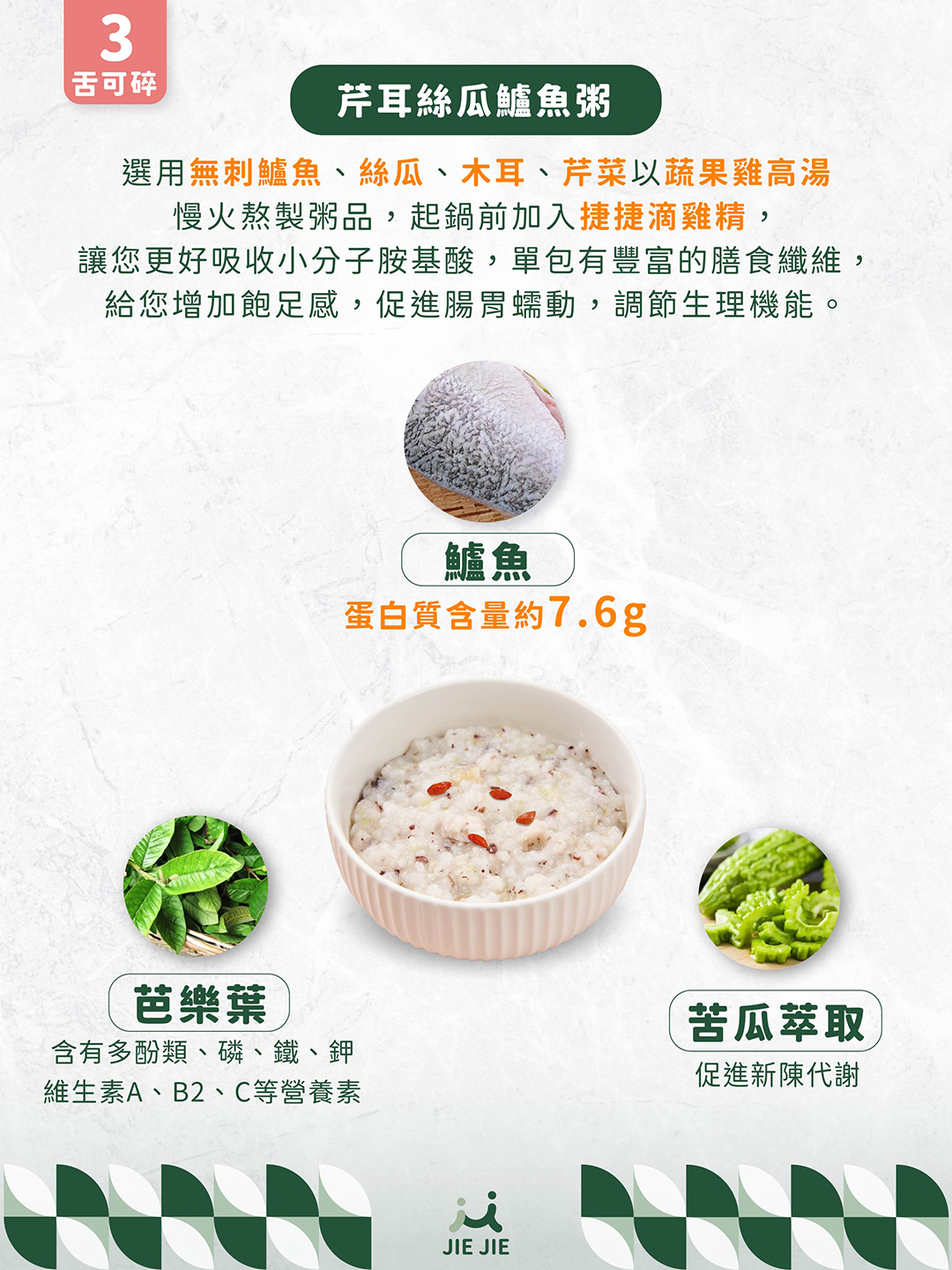 成分:雞骨高湯(水、雞骨、高麗菜、洋蔥、紅蘿蔔、蘋果、薑、蔥)、米、絲瓜、黑木耳、鱸魚、滴雞精、枸杞、芹菜、糙米、橄欖油、薑、鹽、芭樂葉萃取物、苦瓜萃取物