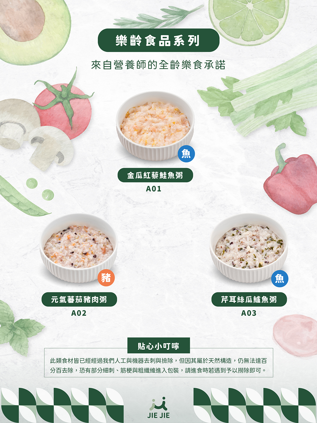 捷捷全系列餐點除了葉菜類產品外,其餘餐點濃稠度可能較濃,如果覺得太濃不好食用,可以加些許高湯或熱開水調整濃度唷!