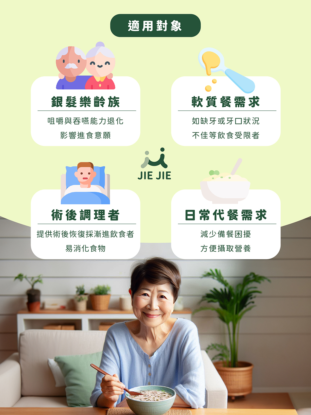 捷捷全系列餐點除了葉菜類產品外,其餘餐點濃稠度可能較濃,如果覺得太濃不好食用,可以加些許高湯或熱開水調整濃度唷!
