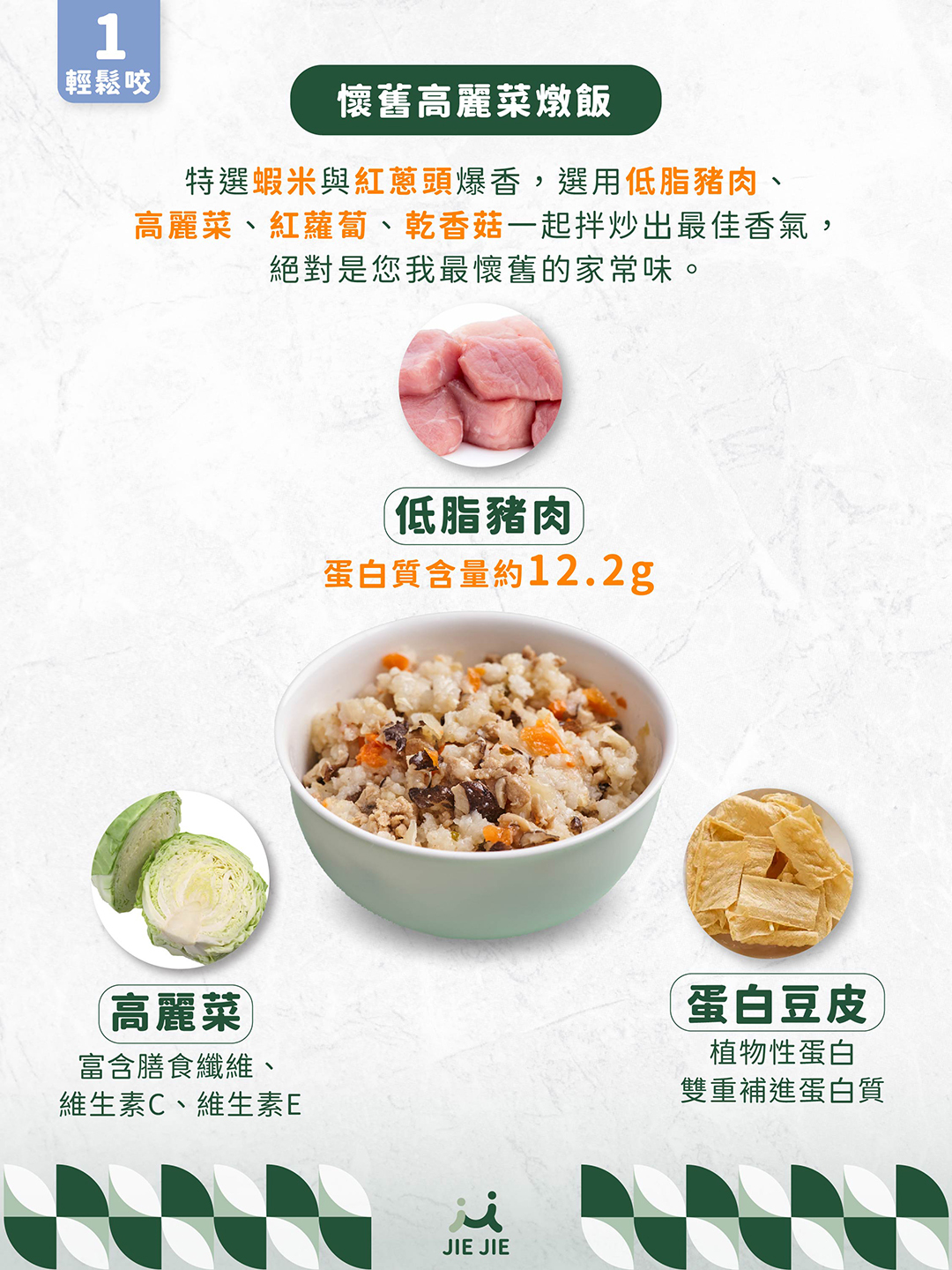 成分:水、豬肉、高麗菜、米、紅蘿蔔、糙米、乾香菇、高蛋白豆皮、橄欖油、蝦米、紅蔥頭、醬油、鹽