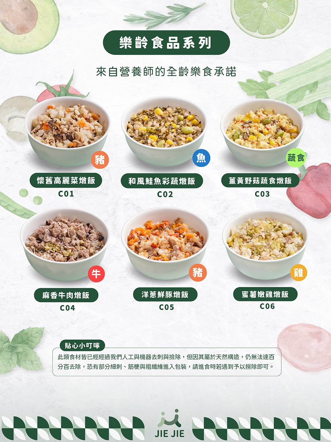 捷捷全系列餐點除了葉菜類產品外,其餘餐點濃稠度可能較濃,如果覺得太濃不好食用,可以加些許高湯或熱開水調整濃度唷!